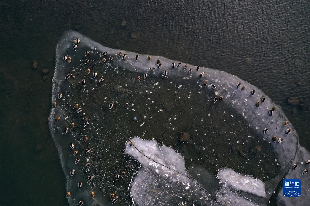 1月5日,候鳥(niǎo)在沈陽(yáng)渾河棲息、覓食(無(wú)人機照片)。