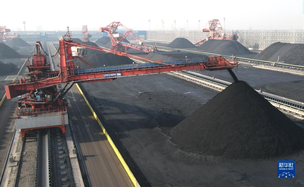 黃驊港煤炭堆場(chǎng)轉運設備在作業(yè)(1月8日攝,無(wú)人機照片)。