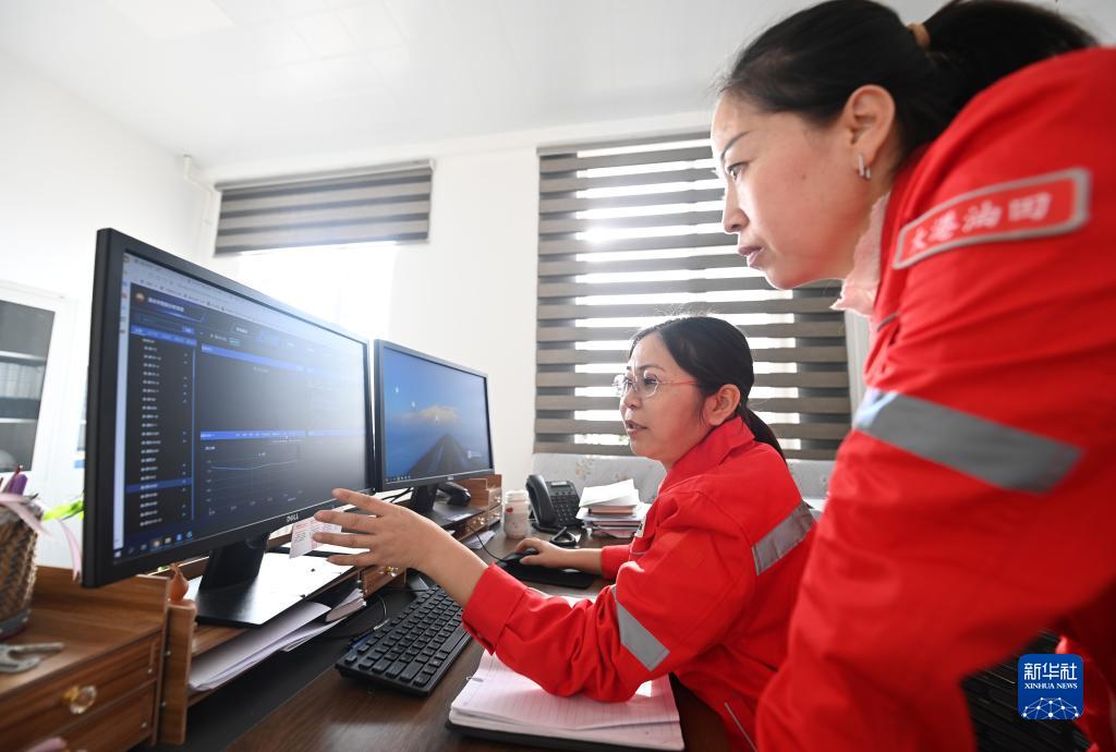尤立紅(左)和同事分析油井生產(chǎn)數據(1月6日攝)。