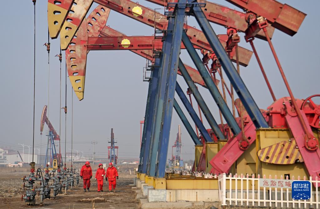 尤立紅(中)和同事在大港油田第五采油廠(chǎng)第一采油作業(yè)區查看設備運行情況(1月6日攝)。