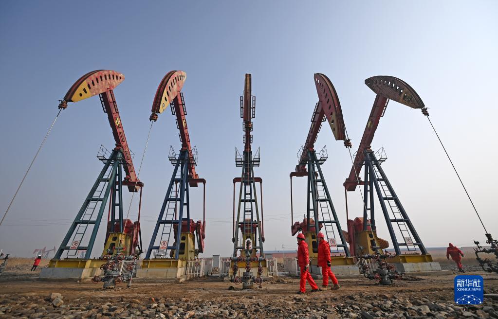 尤立紅(左)和同事在大港油田第五采油廠(chǎng)第一采油作業(yè)區內巡檢(1月6日攝)。