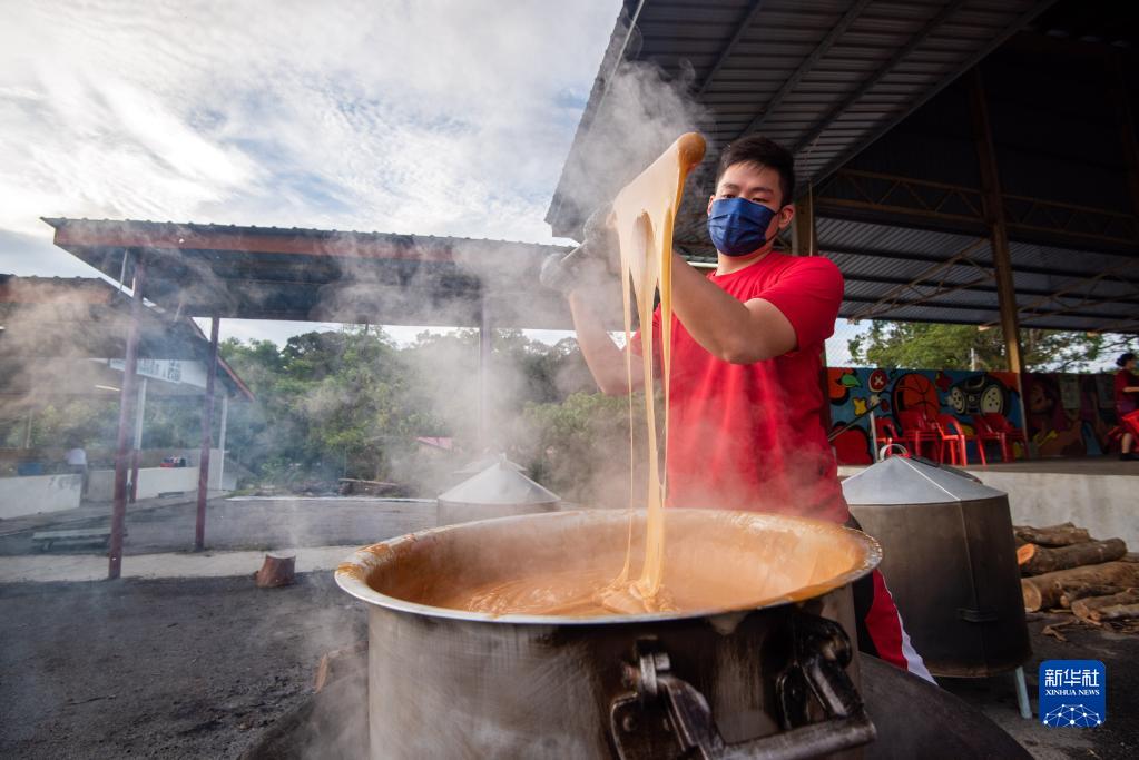 1月8日,在馬來(lái)西亞首都吉隆坡以北約70公里的新古毛,工作人員在攪拌年糕。