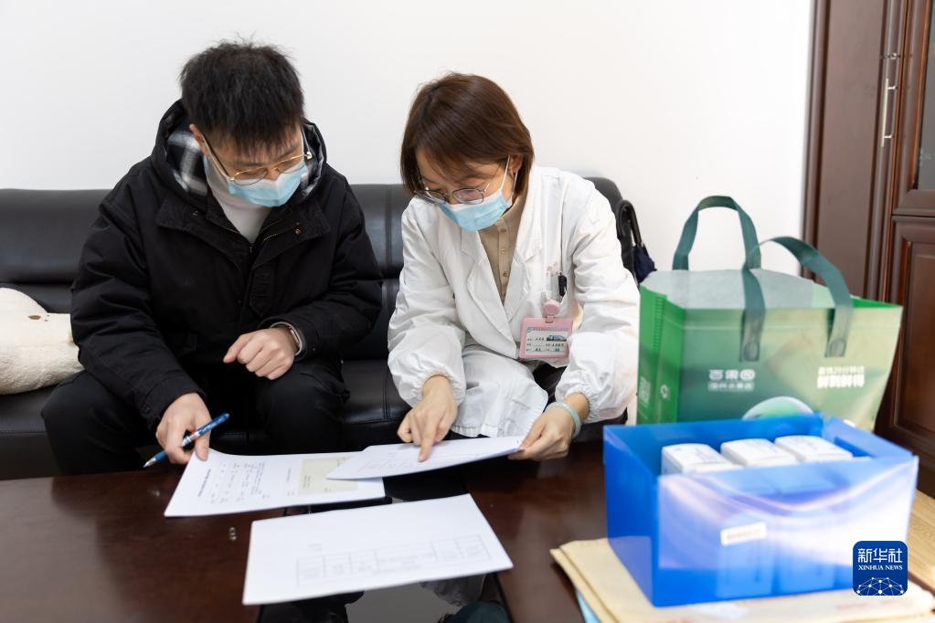 1月8日,在上海市閔行區顓橋社區衛生服務(wù)中心,醫務(wù)科科長(cháng)王莉蕓(右)與護理院工作人員核對新冠小分子藥配送清單。新華社記者 王翔 攝
