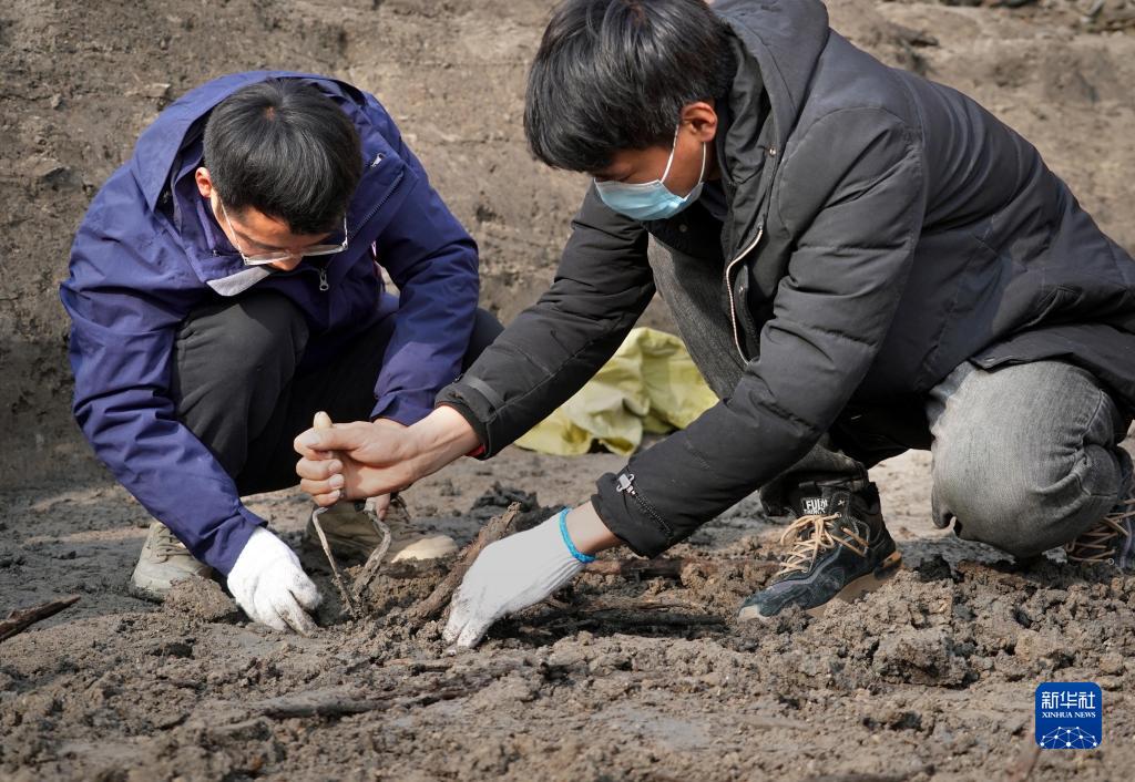 考古工作人員在河南商丘宋國故城遺址發(fā)掘現場(chǎng)清理宋代地層中發(fā)現的柏木堆積(1月6日攝)。