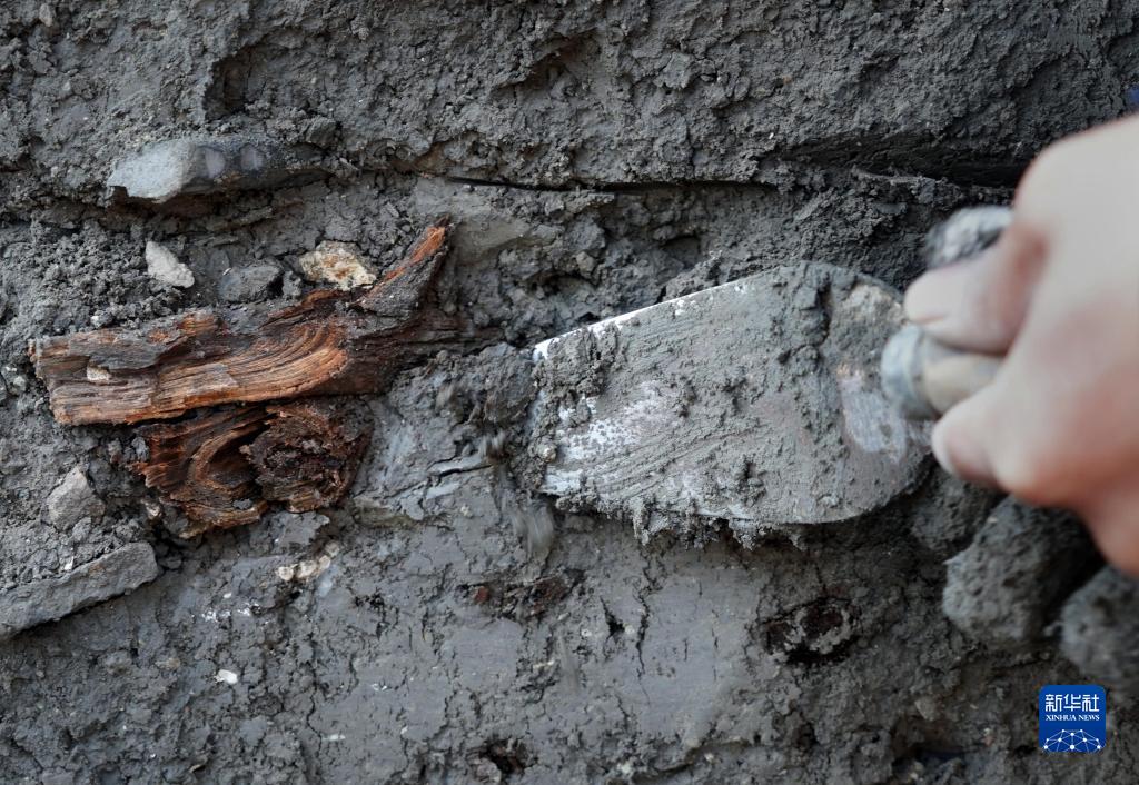 考古工作人員在河南商丘宋國故城遺址發(fā)掘現場(chǎng)清理地層剖面上的柏木(1月6日攝)。