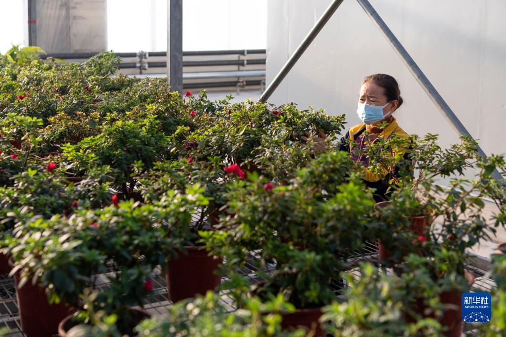 1月9日,工作人員在北大荒建三江國家農業(yè)科技園區內摘除花卉的枯葉。