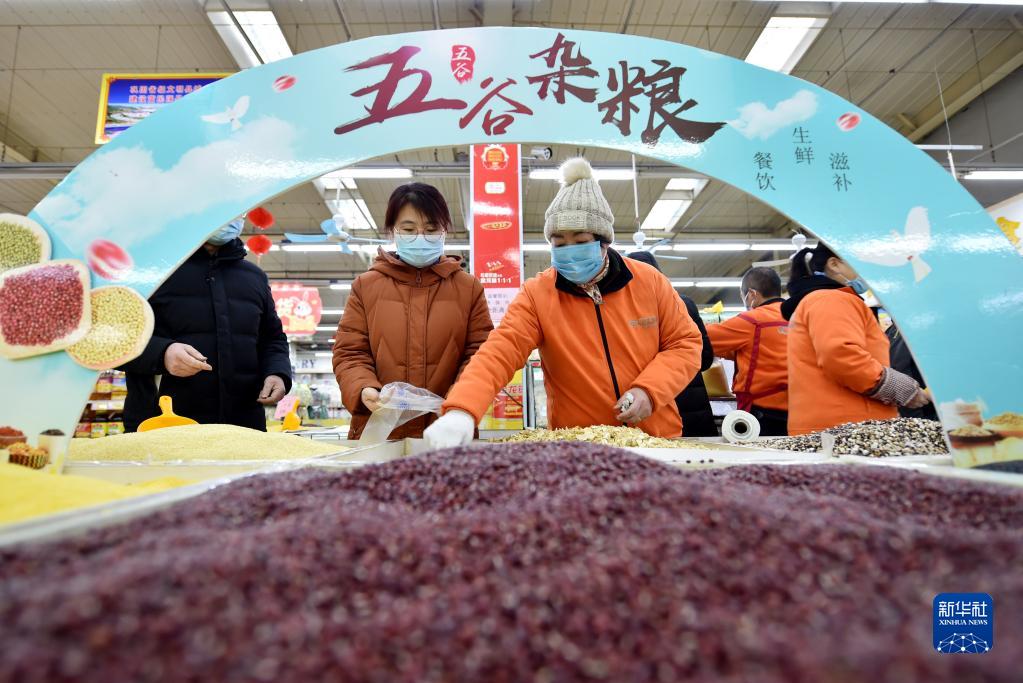1月9日,在河北省石家莊市井陘縣一家商超,群眾購買(mǎi)五谷雜糧。