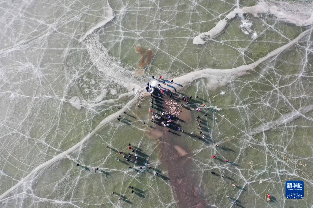 這是土默特左旗哈素海的冬捕現場(chǎng)(1月9日攝,無(wú)人機照片)。