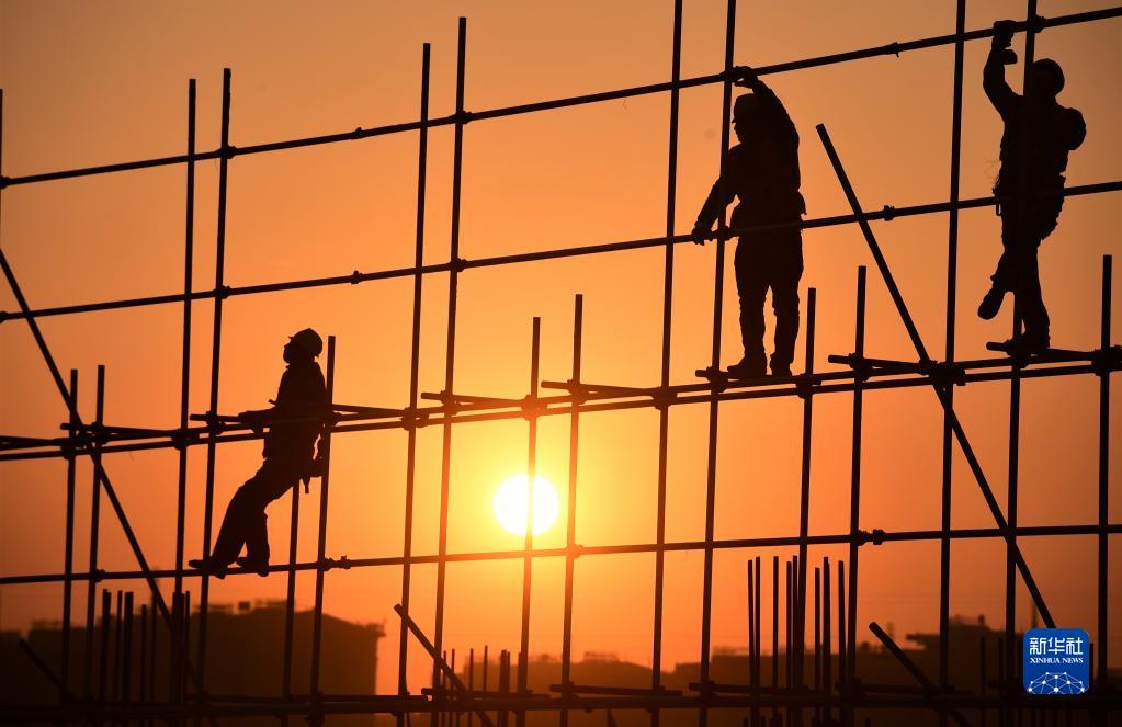 2022年1月1日,在河北雄安新區容西安置房項目D標段施工現場(chǎng),中鐵上海工程局工人在新年第一縷陽(yáng)光的照耀下工作。
