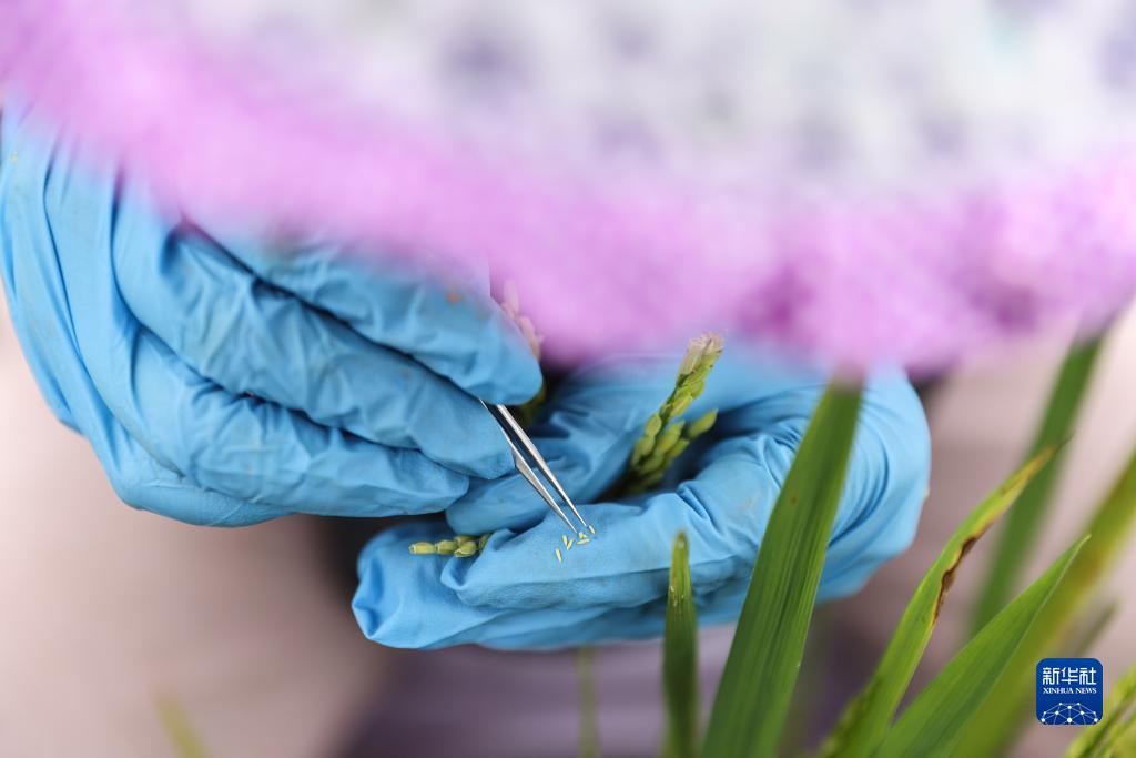 2022年4月1日,于萌在國家南繁科研育種基地里做水稻雜交實(shí)驗。