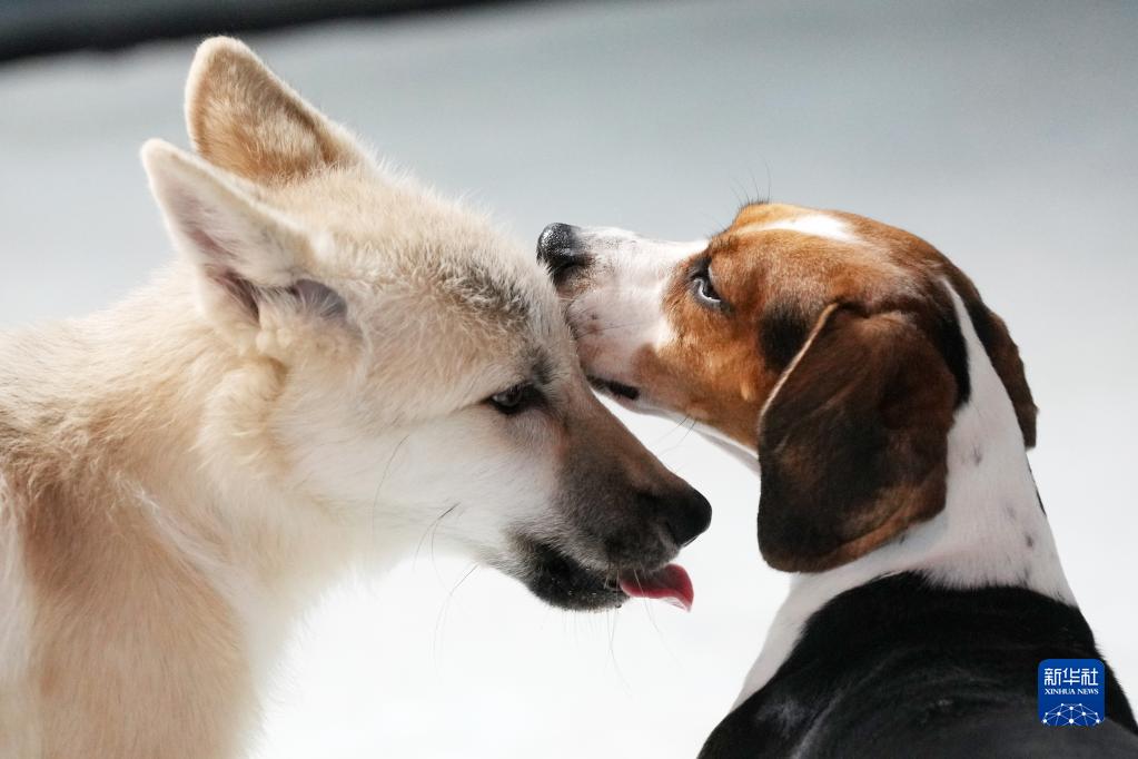 2022年9月26日,在哈爾濱極地公園內,克隆北極狼(左)和它的代孕母體比格犬在一起。這只克隆北極狼的供體細胞來(lái)自于哈爾濱極地公園2006年引進(jìn)的北極狼“瑪雅”的皮膚樣本,代孕母體為一只比格犬。