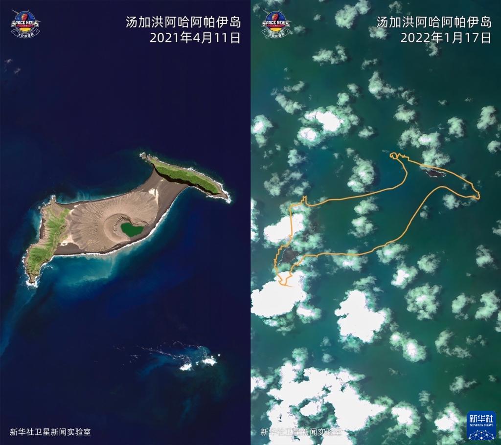 2021年4月11日Worldview02衛星拍攝的湯加洪阿哈阿帕伊島衛星圖片(左)和2022年1月17日“高分一號”衛星拍攝的該島火山噴發(fā)后的衛星圖片,橘色曲線(xiàn)為按照地理坐標標注出的島嶼原先輪廓(拼版照片)。1月14日和15日,太平洋島國湯加的洪阿哈阿帕伊海底火山猛烈噴發(fā)并引發(fā)海嘯。