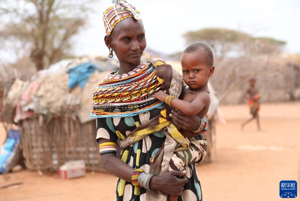 2022年8月26日,在肯尼亞馬薩比特郡萊薩米斯鎮受干旱侵襲的村莊內,一名女子抱著(zhù)孩子。非洲之角地區經(jīng)歷嚴重干旱,索馬里、埃塞俄比亞和肯尼亞超過(guò)1300萬(wàn)人受到嚴重饑餓的威脅。
