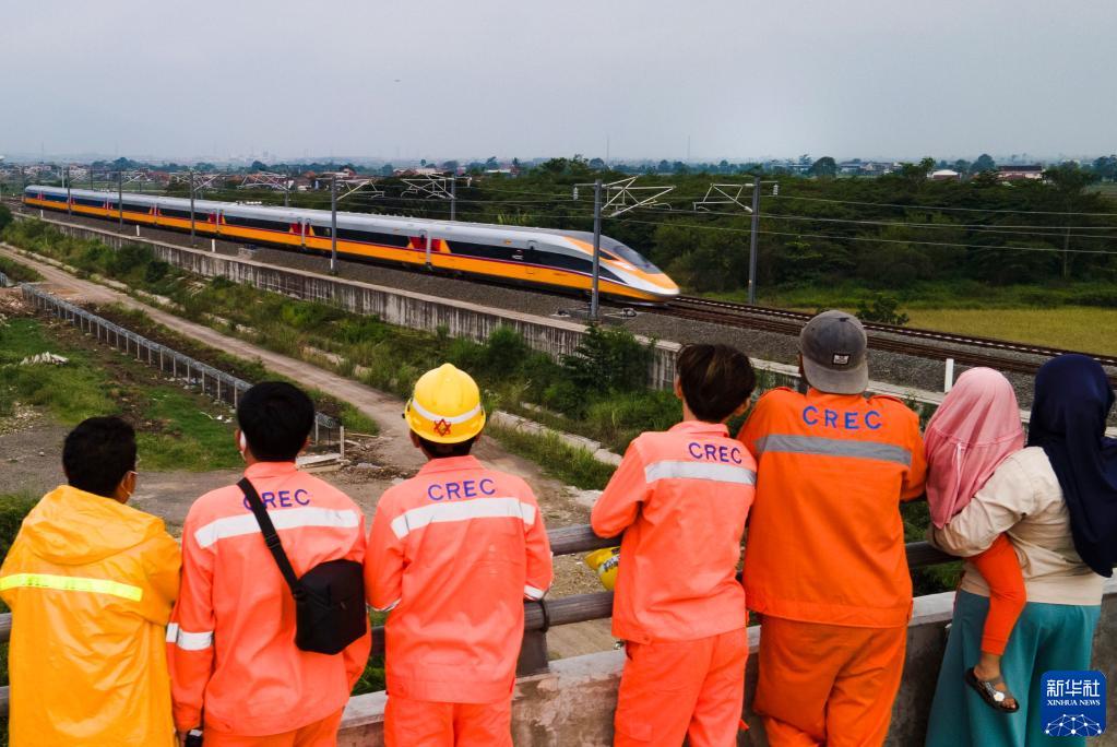 2022年11月16日,在印度尼西亞萬(wàn)隆,雅萬(wàn)高鐵建設者和當地民眾觀(guān)看高速鐵路綜合檢測車(chē)行駛在雅萬(wàn)高鐵試驗段(無(wú)人機照片)。高速鐵路綜合檢測車(chē)當日對雅萬(wàn)高鐵德卡魯爾車(chē)站至4號梁場(chǎng)間線(xiàn)路進(jìn)行了全面檢測,獲取的各項指標參數表現良好。
