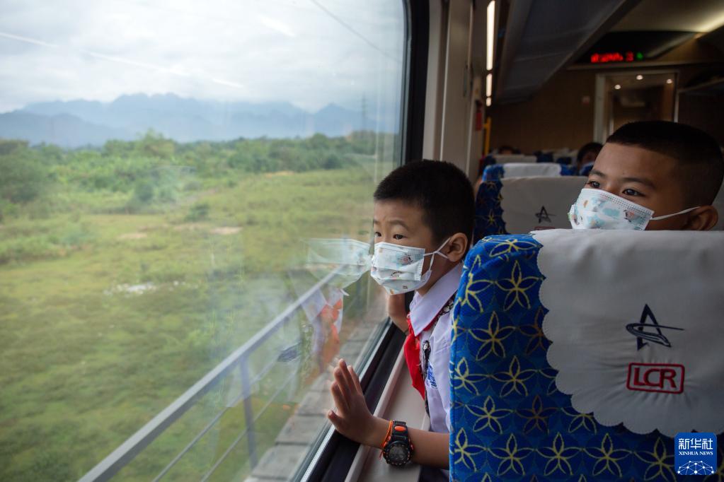 2022年12月1日,中老友好農冰村小學(xué)的學(xué)生乘坐“瀾滄號”動(dòng)車(chē)組欣賞中老鐵路老撾段沿線(xiàn)風(fēng)光。中老鐵路全長(cháng)1035公里,于2021年12月3日開(kāi)通運營(yíng),是“一帶一路”倡議與老撾“變陸鎖國為陸聯(lián)國”戰略對接的重要項目。