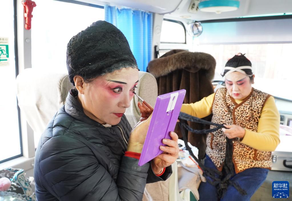 1月9日,在山東省鄆城縣黃集鎮,鄆城縣文化館戲曲演員趙愛(ài)榮(左)在面包車(chē)內的臨時(shí)化妝間化妝。