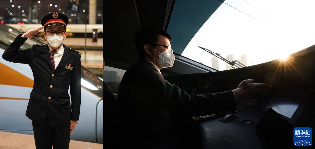 左圖:動(dòng)車(chē)組司機王晗在發(fā)車(chē)前留影;右圖:王晗在駕駛動(dòng)車(chē)組列車(chē)(拼版照片,1月9日攝)。
