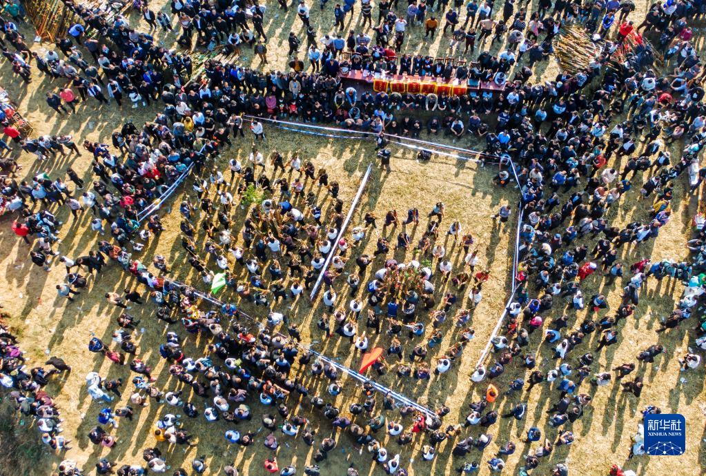 1月9日,在融水縣良寨鄉,人們觀(guān)賞蘆笙比響活動(dòng)(無(wú)人機照片)。