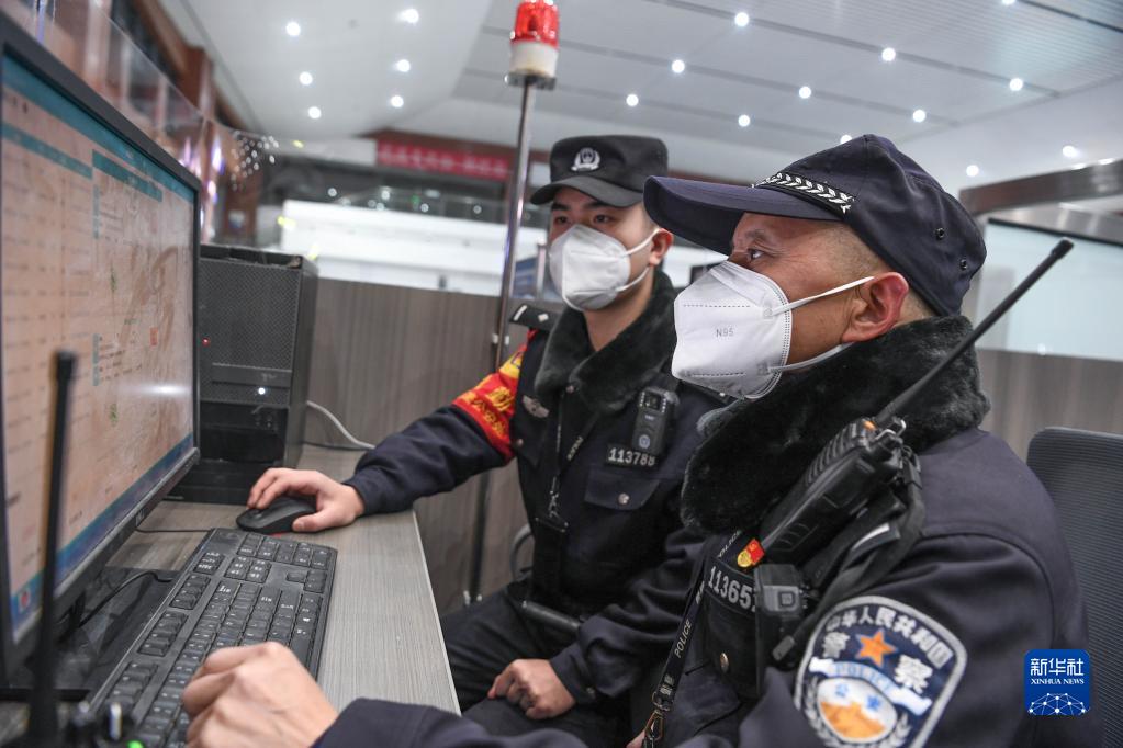 1月8日,鐵路警察王云(右)和謝源在貴陽(yáng)東站核對進(jìn)站乘客身份信息。