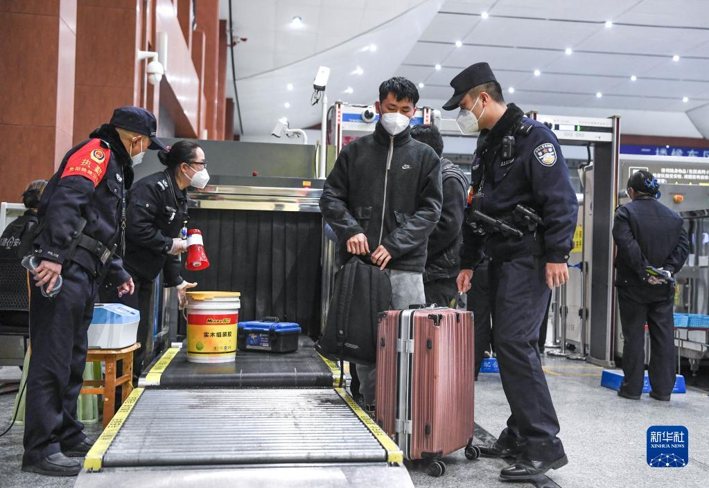 1月8日,鐵路警察王云(前左一)和謝源(前右一)在貴陽(yáng)東站督導乘客進(jìn)站安檢情況。
