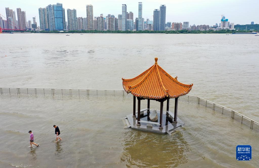 2022年6月11日,兩名市民離開(kāi)湖北武漢武昌區江灘黃花磯涼亭(無(wú)人機照片)。長(cháng)江武漢段水位多日持續上漲,逼近武漢長(cháng)江防汛25米設防水位。