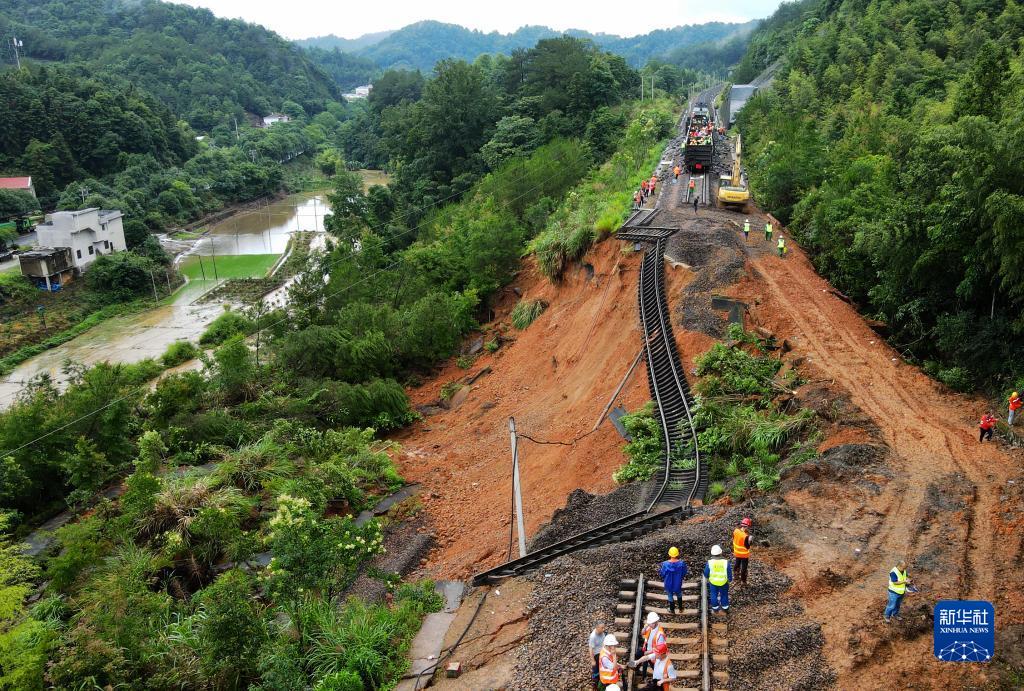 2022年6月14日,在位于龍巖市長(cháng)汀縣的贛龍線(xiàn)金峰山站至長(cháng)汀站區間路堤塌陷現場(chǎng),鐵路部門(mén)組織搶險修復水害地段(無(wú)人機照片)。福建多地連日出現持續強降雨,位于閩西的龍巖市遭遇多輪局地性、突發(fā)性極端暴雨天氣,造成不同程度受災。
