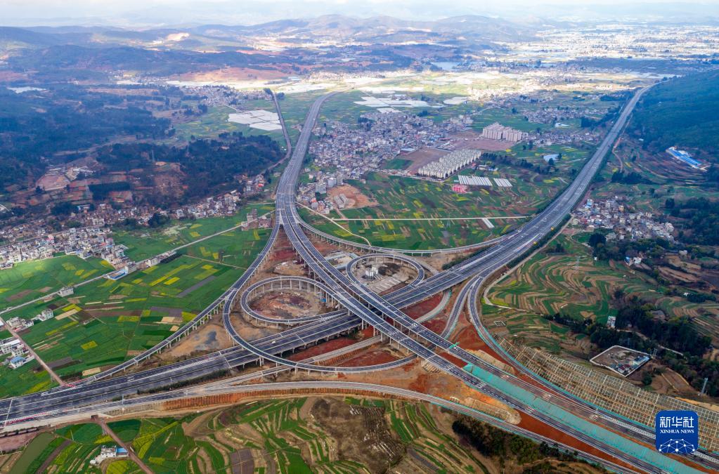 2022年1月21日拍攝的新昆楚高速公路與武易高速公路互通(無(wú)人機照片)。當日,由中國鐵建昆侖投資集團投資建設的云南新昆楚高速公路(昆明至楚雄)建成通車(chē)。新昆楚高速公路起于昆明市五華區岷山附近,止于楚雄州祿豐市廣通鎮,線(xiàn)路全長(cháng)約106公里,橋隧比62.8%,按雙向六車(chē)道高速公路標準建設,設計速度每小時(shí)100公里。