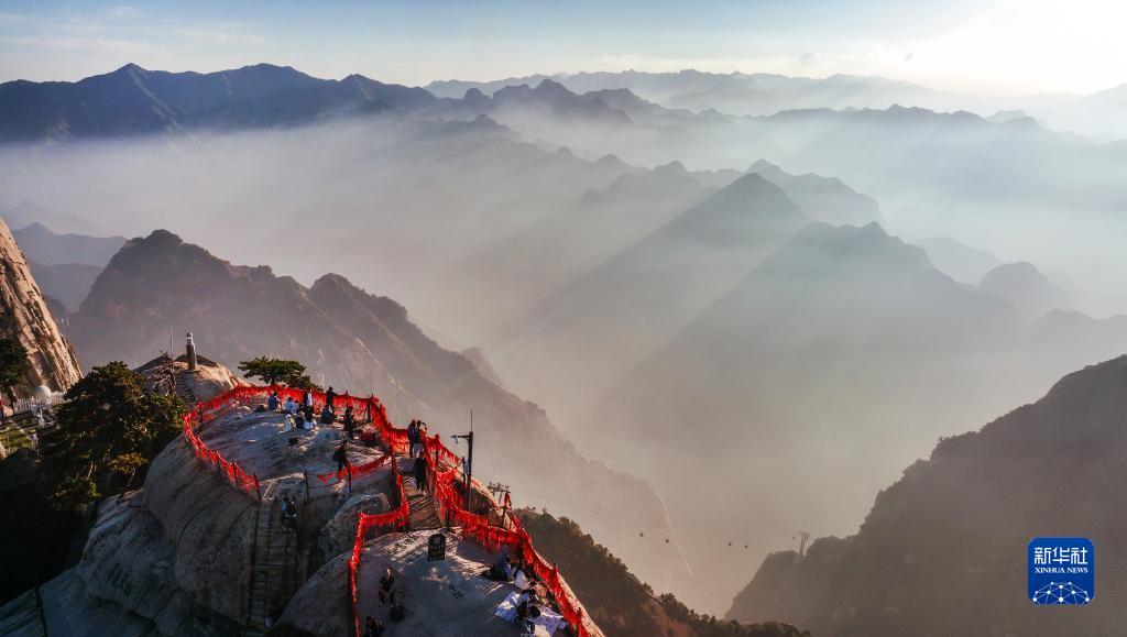 2022年9月25日,夕陽(yáng)西下,雨后初霽的西岳華山,云霧縈繞,宛如仙境(無(wú)人機照片)。
