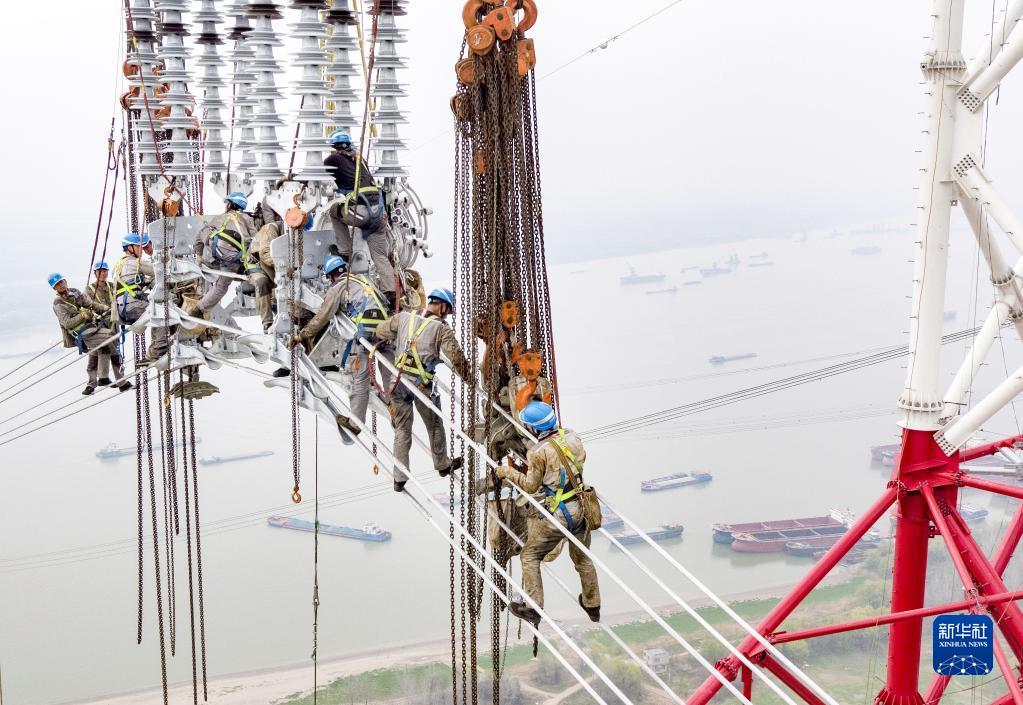 2022年3月13日,在安徽蕪湖的長(cháng)江邊,安徽送變電工程有限公司施工人員在高空進(jìn)行特高壓輸電線(xiàn)路跨江作業(yè)(無(wú)人機照片)。3月14日,白鶴灘—江蘇±800千伏特高壓直流輸電工程安徽段跨越長(cháng)江放線(xiàn)工程完成最后6根導線(xiàn)的展放,標志著(zhù)特高壓“白江線(xiàn)”安徽段長(cháng)江大跨越線(xiàn)路貫通。