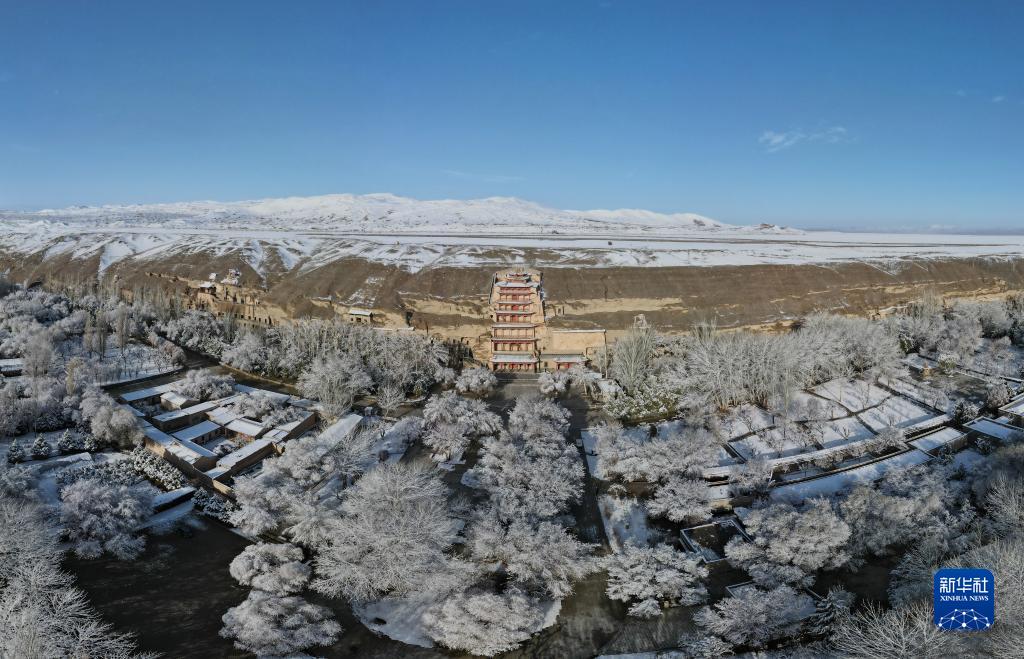 這是2022年3月25日拍攝的敦煌莫高窟景區雪景(無(wú)人機照片)。3月24日至25日,甘肅省敦煌市迎來(lái)一場(chǎng)春雪。雪后的世界文化遺產(chǎn)敦煌莫高窟銀裝素裹,景色如畫(huà)。