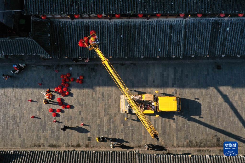 1月9日,工人在貴州省都勻市石板街懸掛紅燈籠(無(wú)人機照片)。
