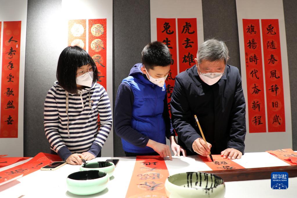 1月9日,在石家莊市劉金凱書(shū)法家工作室,書(shū)法家劉金凱(右)指導書(shū)法小學(xué)員寫(xiě)春聯(lián)。
