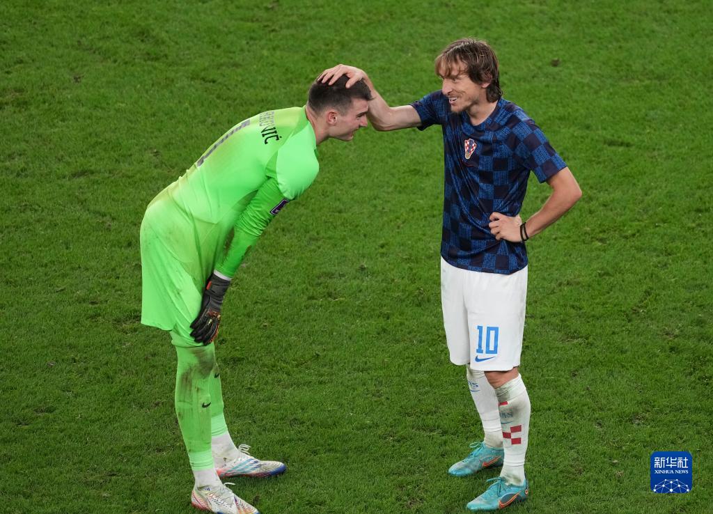 2022年12月5日,克羅地亞隊球員莫德里奇(右)與守門(mén)員利瓦科維奇在比賽后慶祝。