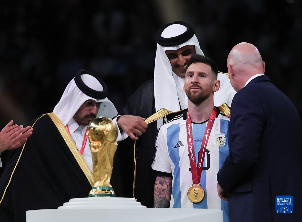 2022年12月18日,卡塔爾埃米爾塔米姆(左二)在頒獎儀式上為阿根廷隊球員梅西(右二)穿上禮服。