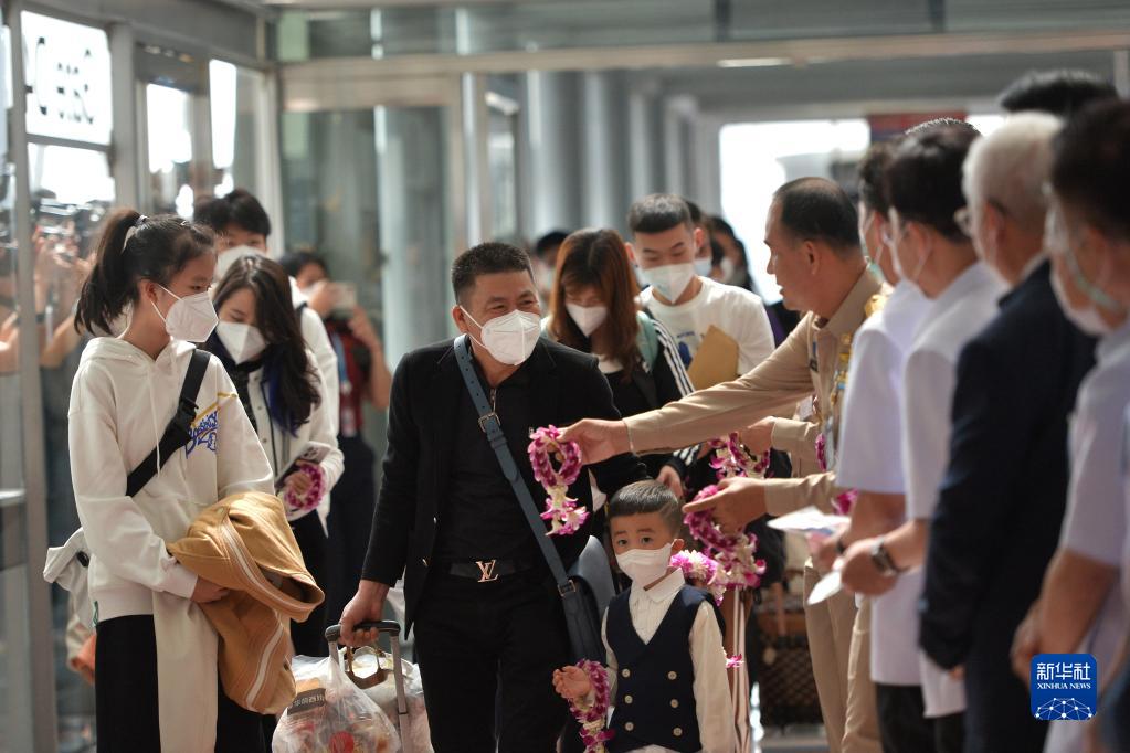 1月9日,泰國官員在位于泰國首都曼谷東郊沙沒(méi)巴干府的素萬(wàn)那普機場(chǎng)歡迎搭乘廈門(mén)航空MF833的旅客。