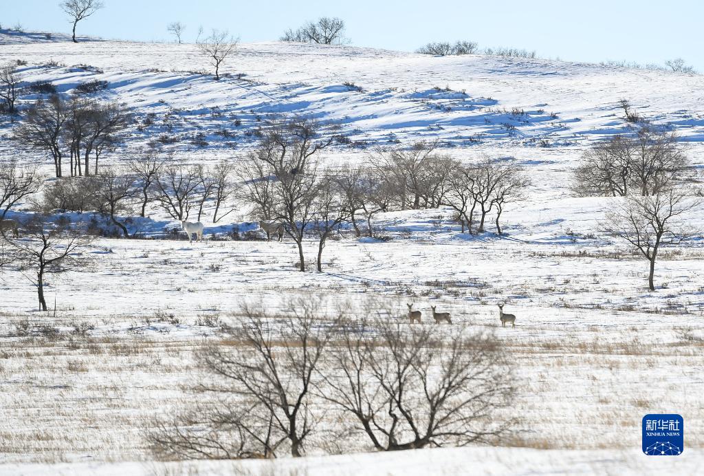 寒冬時(shí)節,內蒙古錫林郭勒盟西烏珠穆沁旗的草原銀裝素裹,樹(shù)木點(diǎn)綴其間,動(dòng)物悠閑覓食,一派美麗的冬日景象。