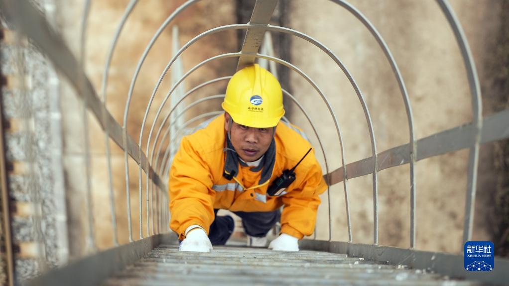 1月9日,中國鐵路南寧局集團有限公司南寧動(dòng)車(chē)所的一名接觸網(wǎng)工爬上燈橋,準備開(kāi)展檢修工作。
