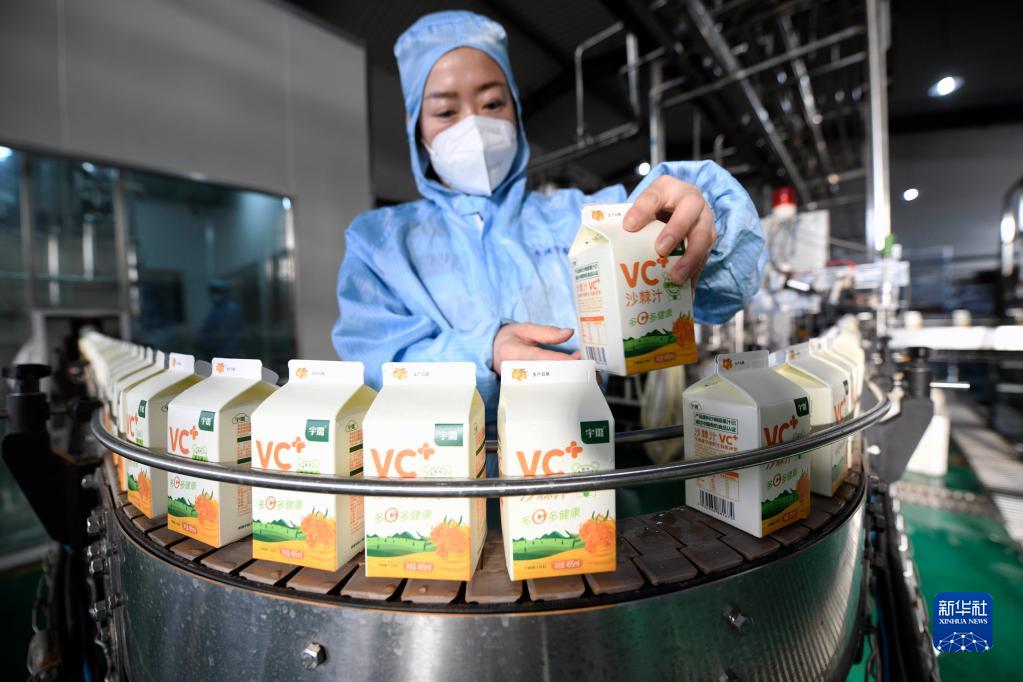 1月10日,在圍場(chǎng)縣一家沙棘深加工企業(yè)的沙棘飲品生產(chǎn)車(chē)間,工人檢查產(chǎn)品質(zhì)量。