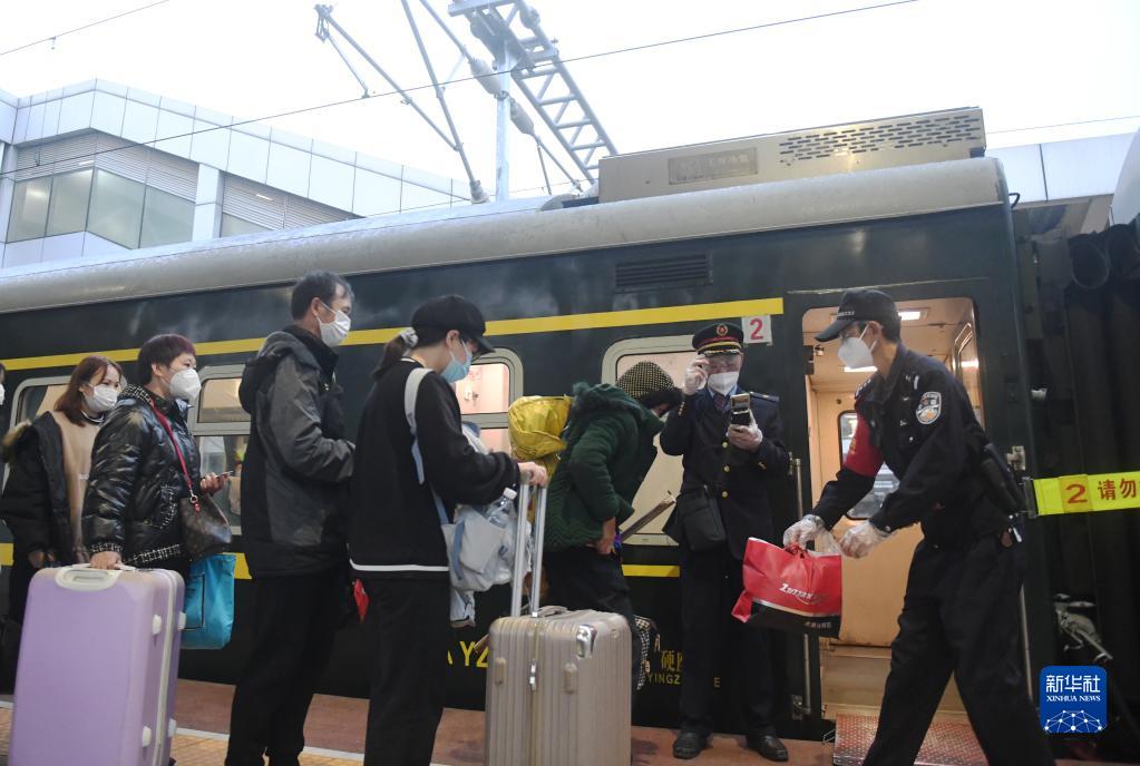 1月10日,覃業(yè)民在南寧站引導旅客有序上車(chē)。