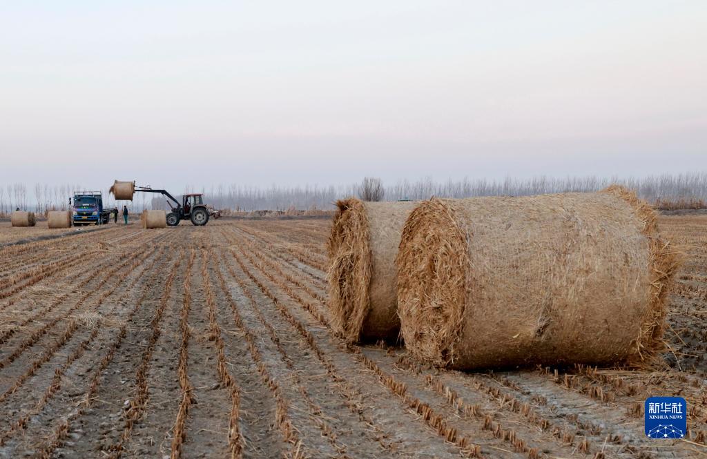 1月10日,在唐山市豐南區大新莊鎮大佟莊村田間,一家生物質(zhì)發(fā)電企業(yè)的工人將打好捆的稻草裝車(chē)。