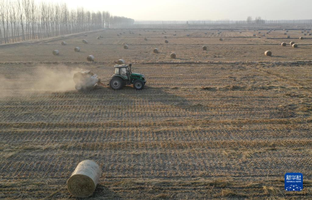 1月10日,在唐山市豐南區大新莊鎮大佟莊村田間,農機手駕駛農機將稻草回收打捆(無(wú)人機照片)。
