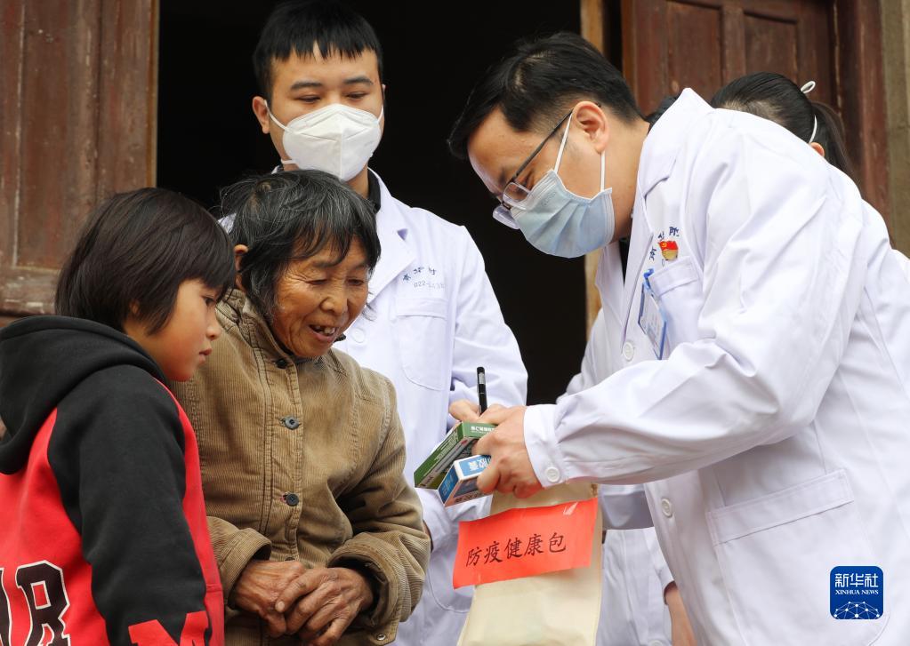 1月10日,在郴州市安仁縣渡口鄉長(cháng)灘村,來(lái)自南華大學(xué)第一臨床學(xué)院的志愿者給當地村民送上健康包并指導用藥。