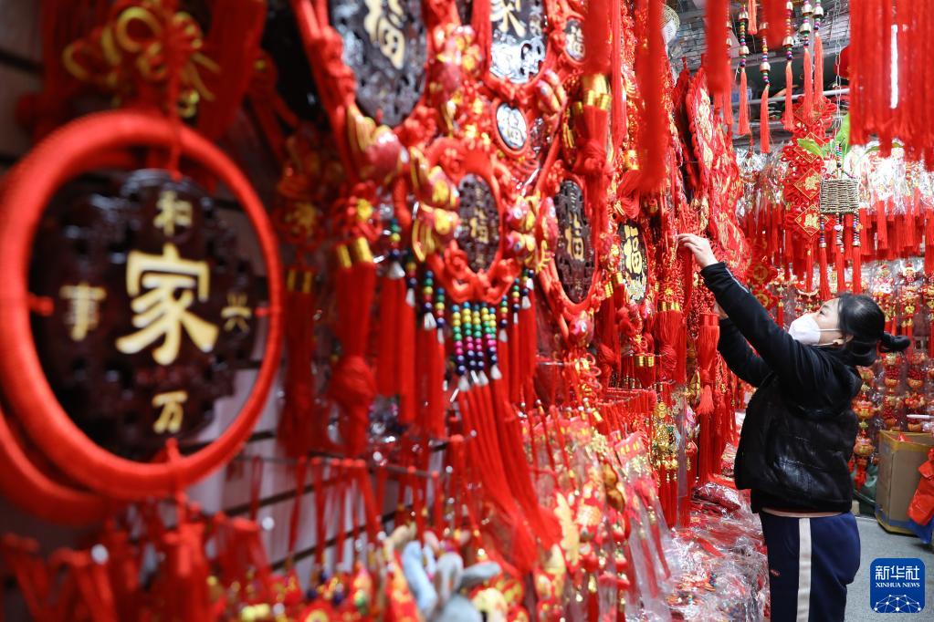 1月11日,遼寧沈陽(yáng)五愛(ài)國際小商品城的一位店主在整理貨品。