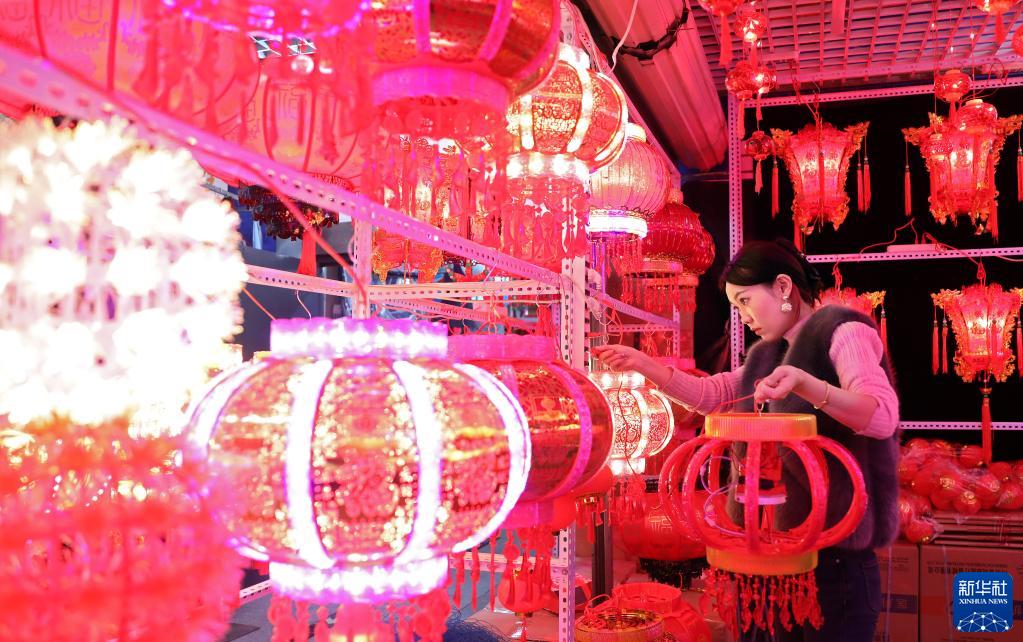 1月11日,遼寧沈陽(yáng)五愛(ài)國際小商品城的一位店主在整理測試燈籠。
