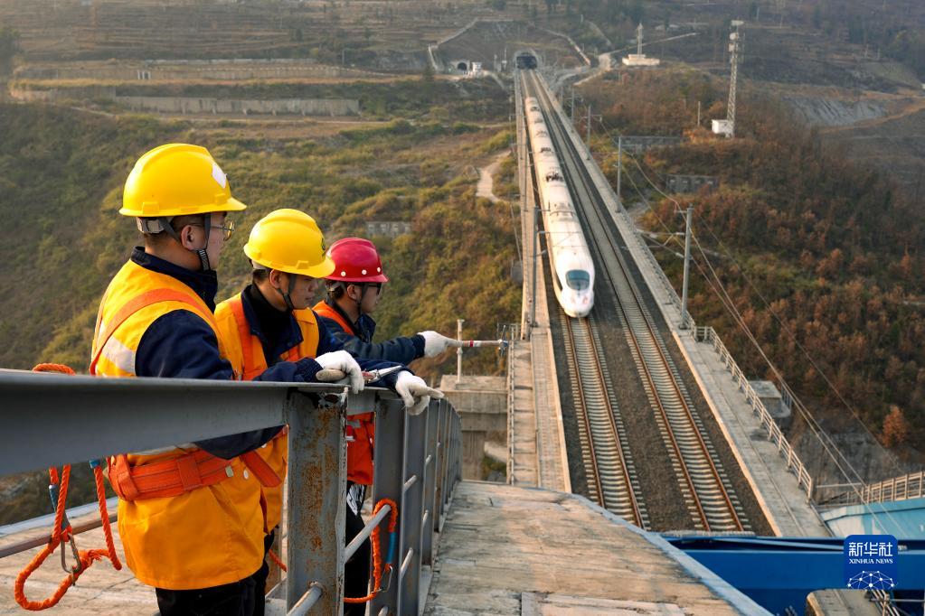 成貴高鐵鴨池河特大橋橫跨貴州省黔西市境內的鴨池河,在地勢險峻的峽谷間,每天約有100多組春運動(dòng)車(chē)穿行經(jīng)過(guò)。在最高處距離河面約277米的大橋上,鐵路職工堅守崗位,嚴格巡檢,對大橋的鋼結構、供電設備、橋梁支座、外包混凝土等進(jìn)行細致檢查,根據列車(chē)運行情況調整軌道線(xiàn)路的幾何尺寸、進(jìn)行鋼軌探傷等作業(yè),全力保障春運期間動(dòng)車(chē)組安全通過(guò)。