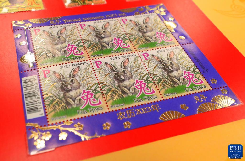 這是1月10日拍攝的白俄羅斯通信與信息化部發(fā)行的中國兔年郵票。