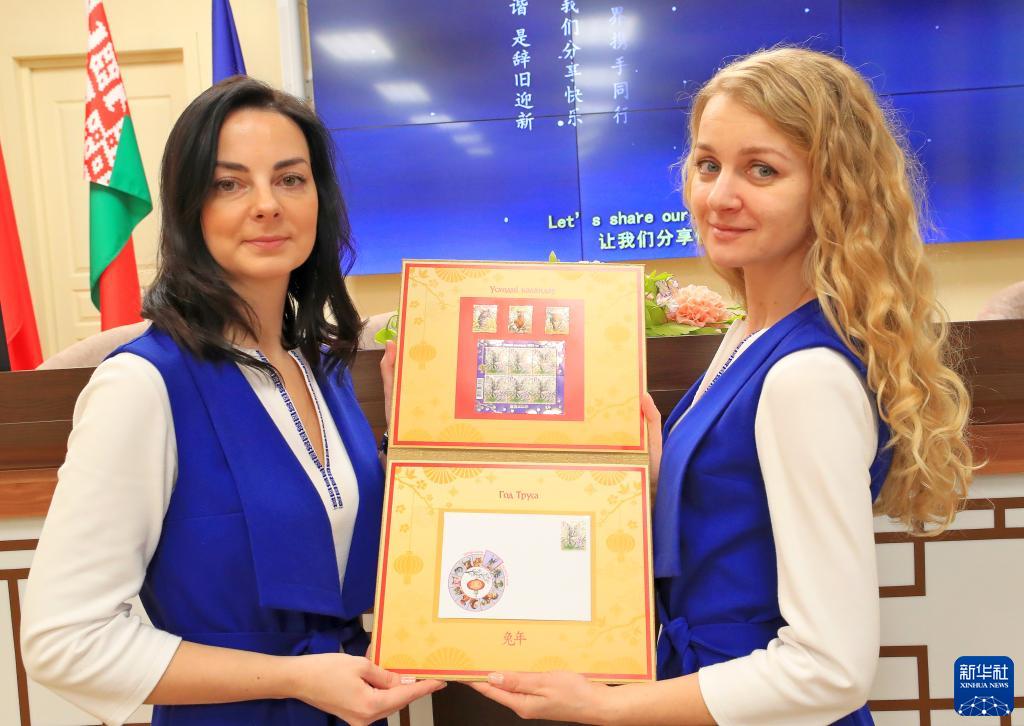 1月10日,在白俄羅斯明斯克,工作人員展示白俄羅斯通信與信息化部發(fā)行的中國兔年郵票和首日封。