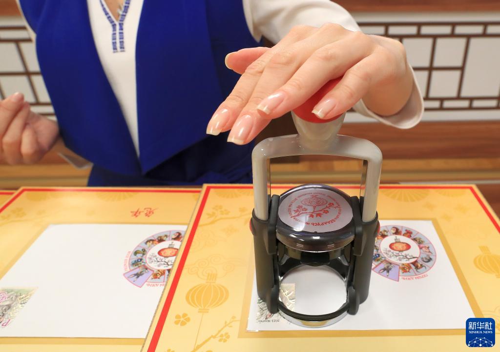 1月10日,在白俄羅斯明斯克,工作人員在白俄羅斯通信與信息化部發(fā)行的中國兔年首日封上蓋戳。