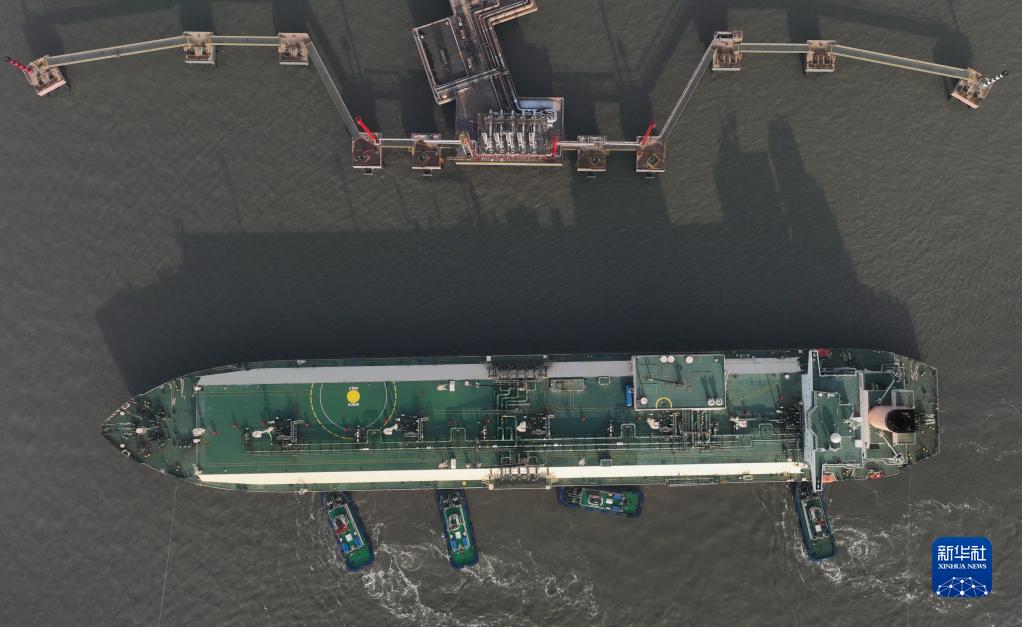 1月11日,一艘LNG船在拖輪的協(xié)助下向唐山港曹妃甸港區中石油液化天然氣接收站碼頭靠泊(無(wú)人機照片)。