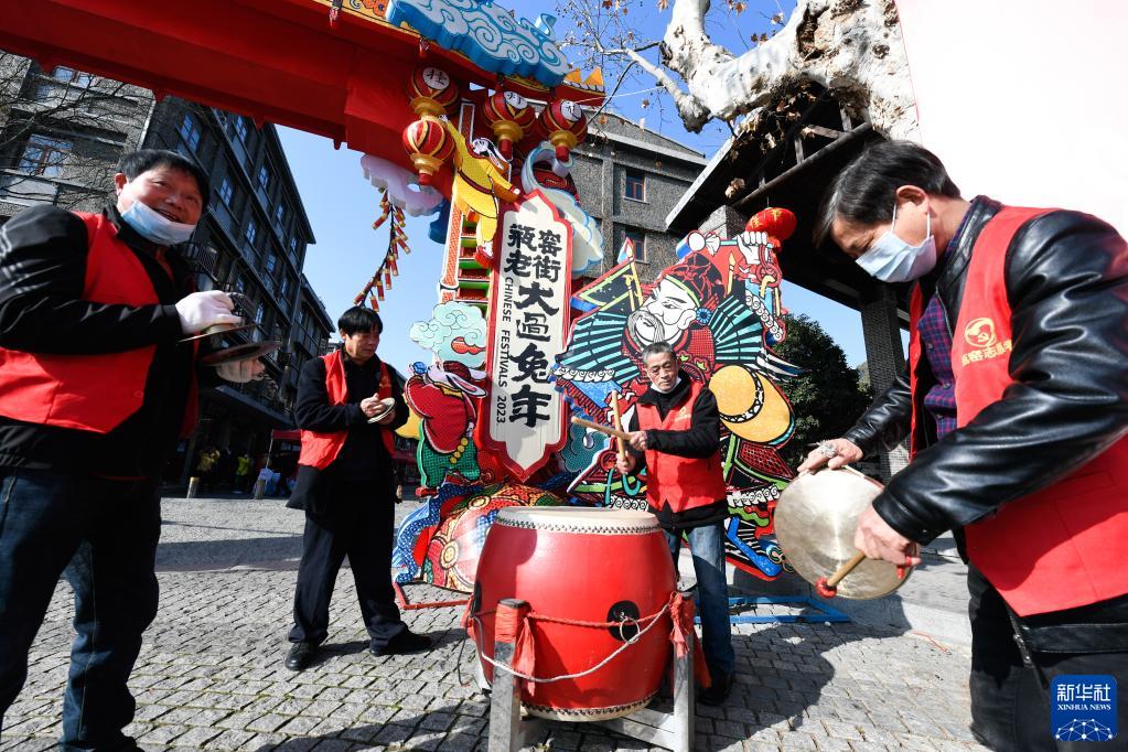 1月11日,人們在杭州市余杭區瓶窯鎮瓶窯老街敲響新春鑼鼓,慶祝老街年貨節開(kāi)幕。